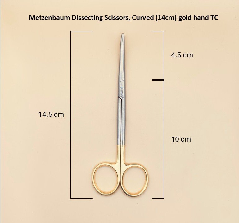 - 1 x Metzenbaum Dissecting Scissors, Curved 5.5″ (14cm) gold hand TC \\n