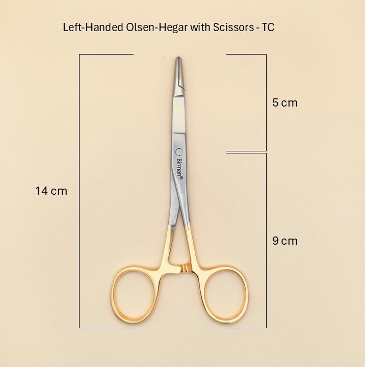- High premium stainless steel TC Left-Handed Olsen-Hegar with Scissors ( 14 cm )