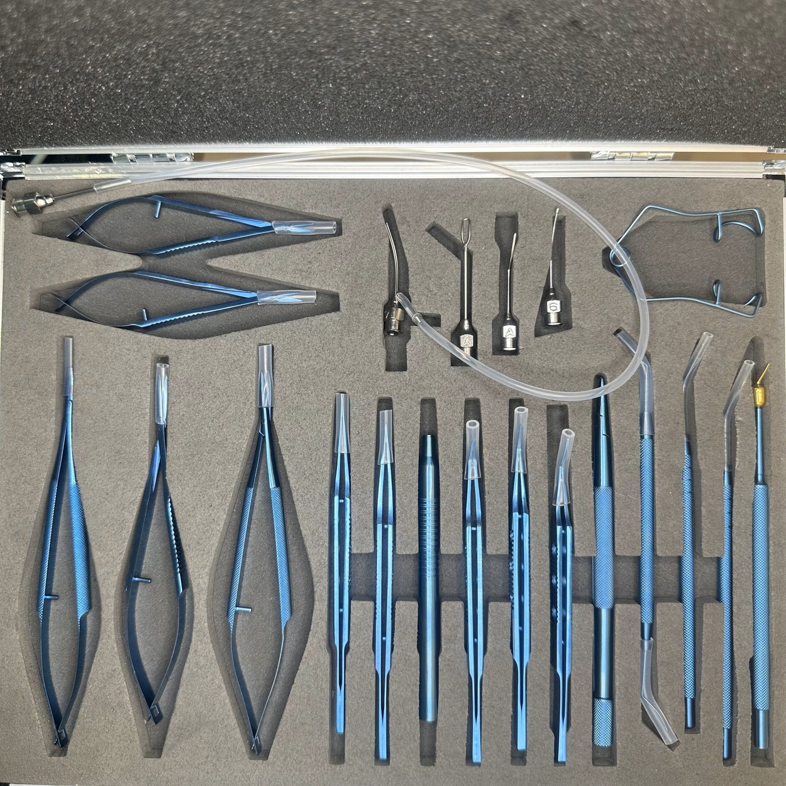 - Ophthalmic Instrument \\n1: Irrigation/Aspiration Caunula \\n2: Wire Speculum \\n3:Irrigation Cannula \\n4:Irrigation Cannula \\n5:Infusion Lens Loop \\n6: Castroviejo Spatula \\n7:Cautery \\n8:10l Fixation Hook \\n9:10l Fixation Hook \\n10:Blade Holder \\n11:Infusion Handpiece \\n12: Vannas Scissors Straight \\n13: Vannas Scissors Curved \\n14: Tying Forceps \\n15. Corneal Scleral Forceps \\n16. Needle Holder Straight \\n17. Intraocular Lens Forceps \\n18. Capsulotomy scissor curved \\n19. Corneal Scissors curved \\n20. Angle Tying Forceps \\n21. Teethed Angle Forceps \\n