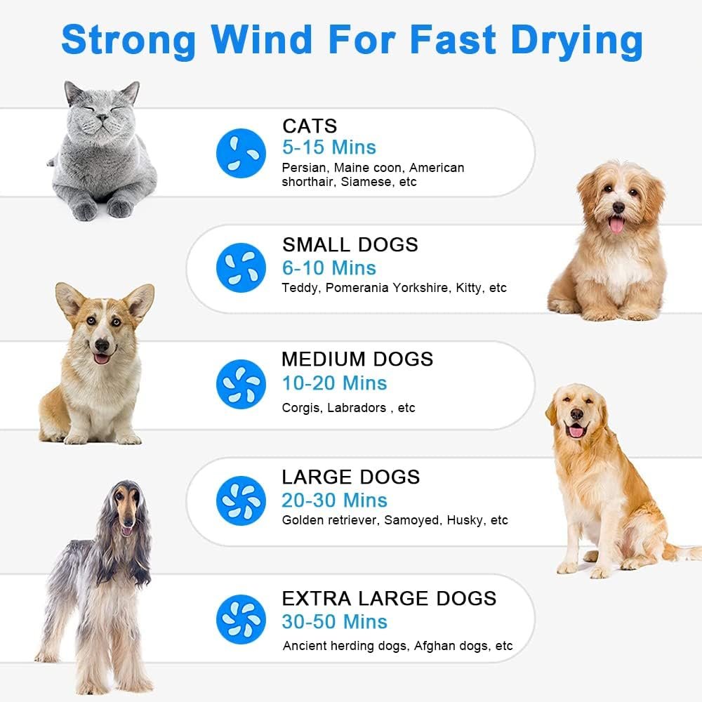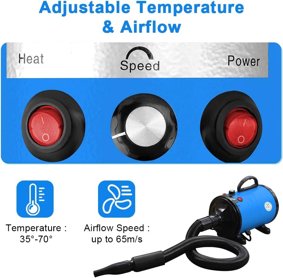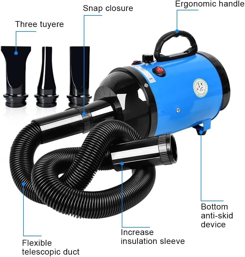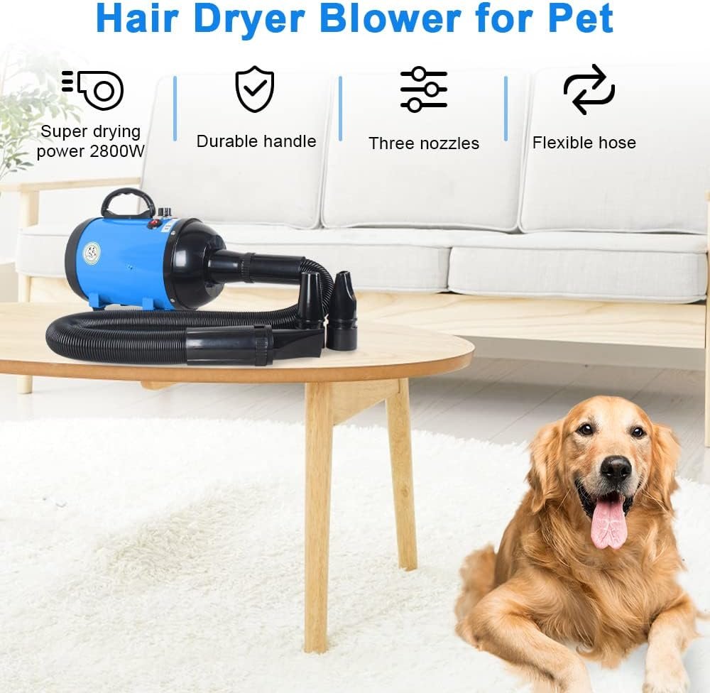 \\nName : Pet Hair dryer \\nColor : blue \\nOutput : 500-2800W \\nVoltage : AC 220V \\nProduct function : Disperse moisture, dry hair only takes 10-20 minutes \\nTemperature : 35 - 70 degrees (adjustable) \\nWind speed : 25 - 65 M/S (adjustable) \\nNoise : ≤50dBTechnical Specifications