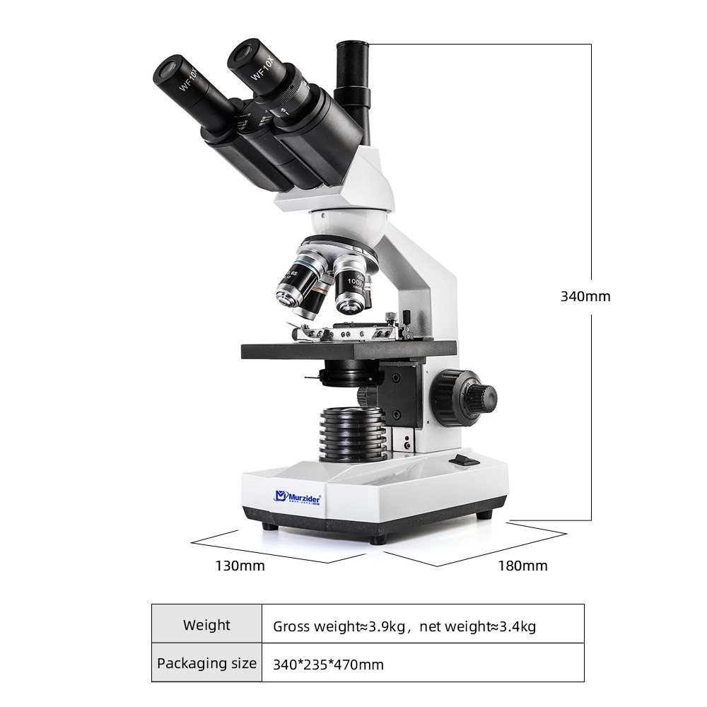 - Performance Features: Suitable for fields such as biology, pathology, and bacteriology. With appropriate auxiliary equipment, it can realize image acquisition, storage, and analysis processing; it can observe bacteria, cells, and microorganisms. Eyepieces: Wide field of view eyepiece WF10X ● Wide field of view eyepiece WF16X. Objectives: Achromatic objectives 4X/10X/40X(S)/100X(S, Oil) ● Trinocular eyepiece tube ● Observation head: Hinged, 30° tilt, 360° rotation ● Diopter: 5 degrees diopter adjustment ● Interpupillary distance: 55-75mm ● Stage: Double-layer mechanical stage, size: 140X155mm ● Movement range: 70X5